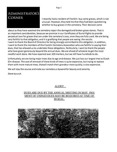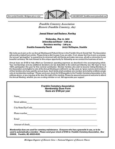 Join us on Thursday, May 14, 2026, for the Franklin Cemetery Association’s Annual Meeting, held at the Community Church in Franklin.