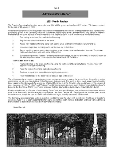The official meeting will begin promptly at 7:00 P.M., where we’ll discuss updates, future plans, and matters important to our community and the continued care of the Historic Franklin Cemetery.