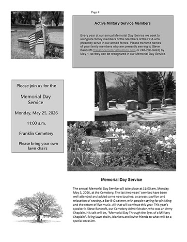 Join us on Monday, May 25, 2026, at 11:00 A.M. for the Franklin Cemetery Association’s (FCA) Memorial Day Service, a solemn and meaningful tribute to the heroes who gave their lives in service to our nation.